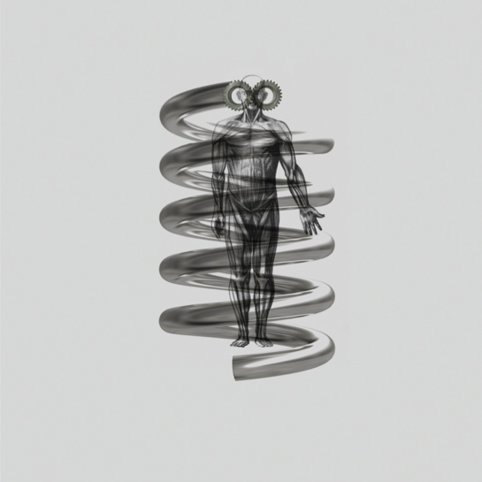 Nostromo 7: An experimental, futuristic, electro music project with dark dystopian visions of the future. A long standing relationship since 2006 has allowed me to utilise many skills such as hand drawing not widely used in graphic design projects. Enabling me to create designs fitting with their visions of humans becoming integrated in the future with the machines we currently use for communication and efficiency. The album cover design represents the future in terms of the upward spiral and the merging of the industrial and human elements with the iron spiral stairs reminiscent of the DNA spiral. Nostromo designs have featured in many industry magazines and the logo design was the German winner in the International logo design awards.